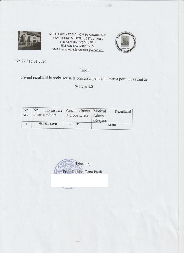 Rezultatul la proba scrisă la Concursul pentru ocuparea postului vacant Secretar I, S